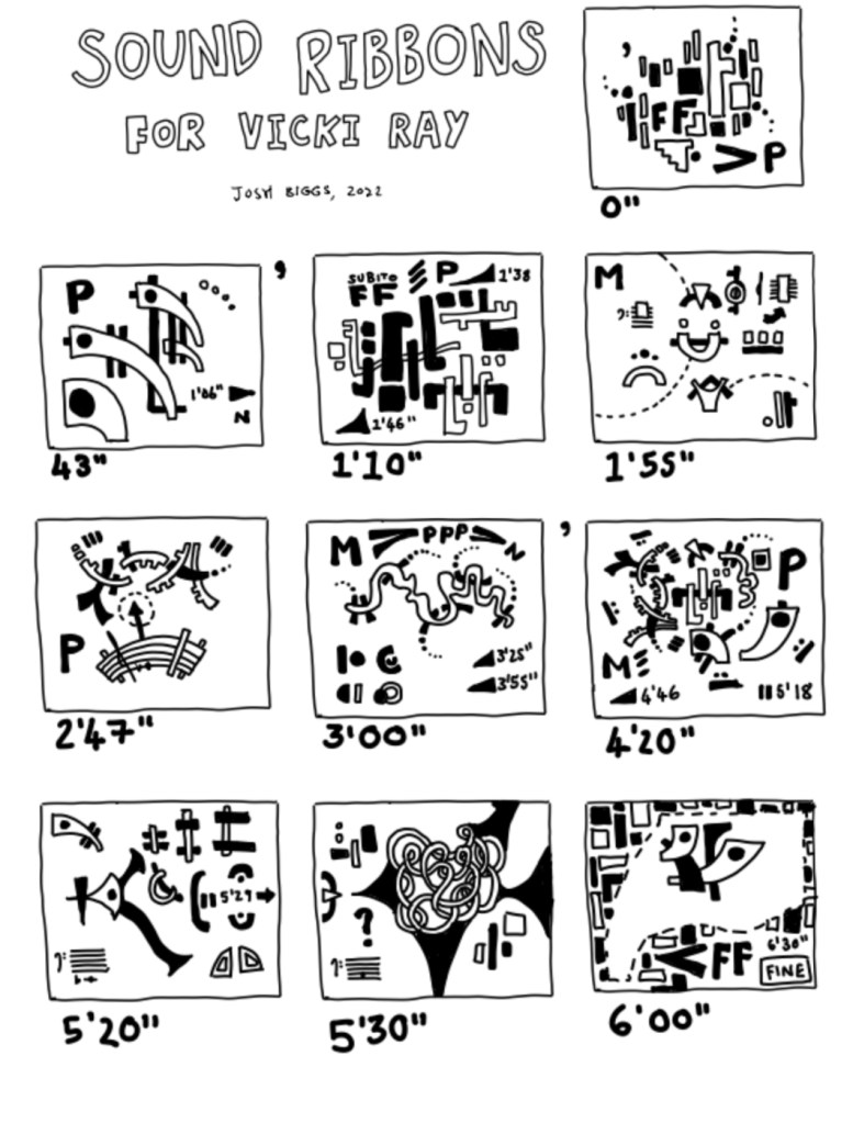 Sound Ribbons for Vicki Ray (2022) combines live improvisation for piano with a fixed electronics part featuring pre-recorded, processed, and re-arranged improvisations by the pianist from June 2022. Together, the live and pre-recorded improvisations entangle in dreamlike, practice-room-corridor chaos. The June improvisations were digitally transcribed and re-orchestrated for a chorus of five sampled pianos spanning four centuries from the Cornell Center for Historical Keyboards in Ithaca, New York. Each piano’s unique temperament and timbral color combine and collide to offer new meanings and expressivities to Vicki’s playing. The piece is graphically notated with timings and abstract mnemonic symbols that enable synchronization as well as spontaneity. For more information on my research project with the Cornell Center for Historical Keyboards, here is a link to my research profile on their website.