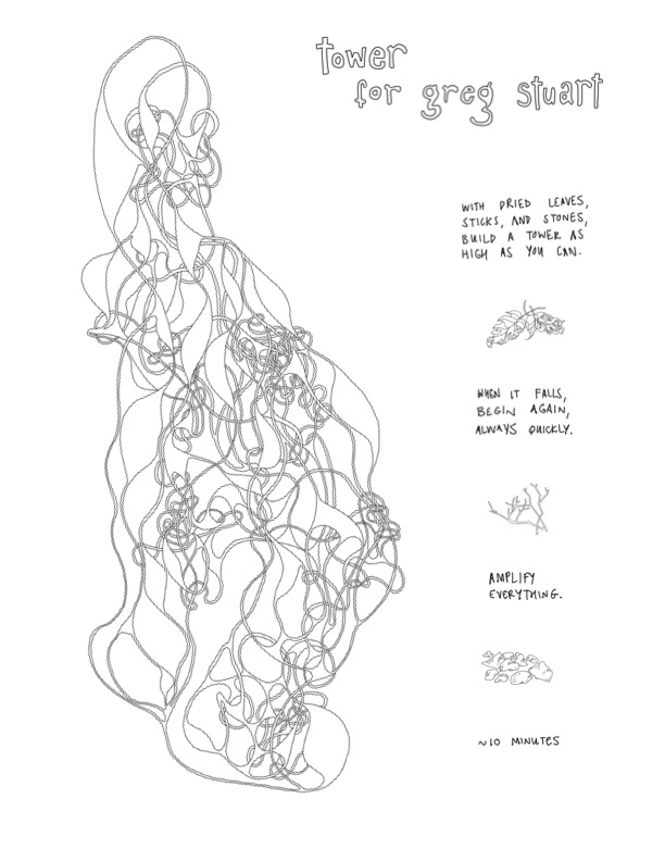 tower for greg stuart (2022) is an amplified meditation on failure and virtuosity, improvisation and control. Over the course of the piece, Stuart uses found instruments—dried leaves, sticks and stones—to build a tower as high as he can until it falls.